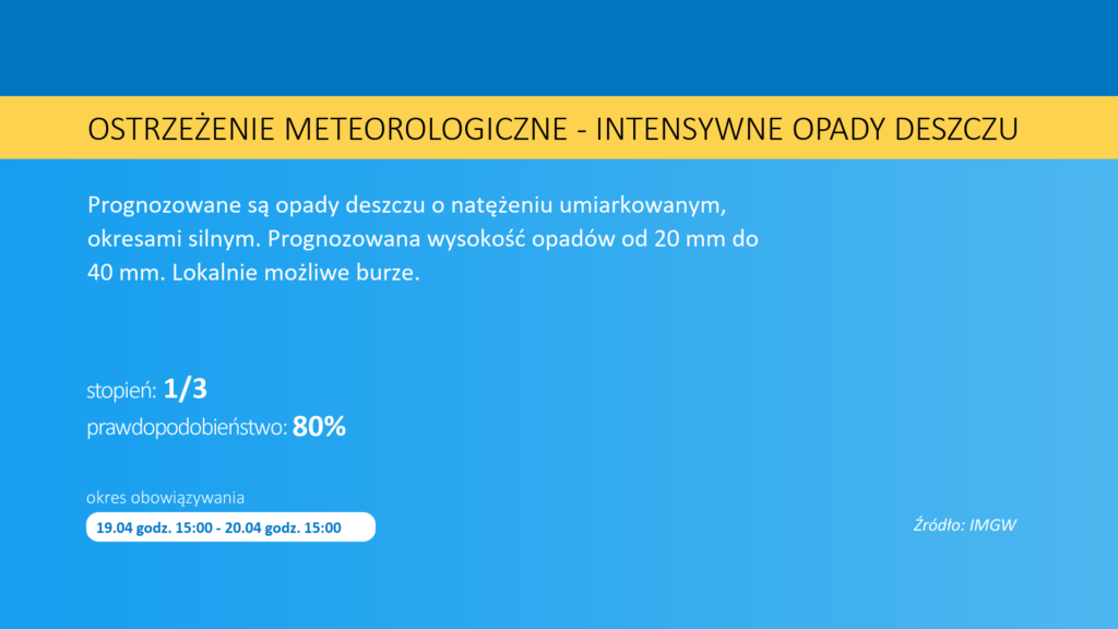 Synoptycy zwracają również uwagę na możliwość wystąpienia burz, które mogą dodatkowo nasilić intensywność opadów. Najbardziej niebezpieczny okres przewidywany jest na niedzielny wieczór oraz noc z niedzieli na poniedziałek, kiedy opady mogą osiągać największe natężenie.
